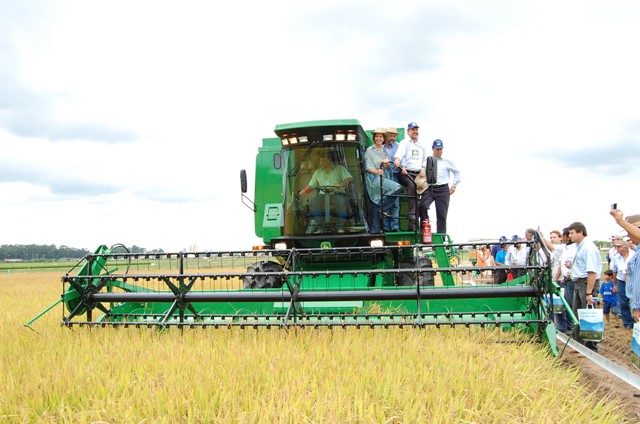 A governadora Yeda Crusius abriu oficialmente a colheita do arroz no Brasil neste domingo (2), na Estação Experimental do Instituto Rio Grandense do Arroz (Irga), em Cachoeirinha. A safra, estimada em 7 milhões de toneladas no Estado, já começou a ser colhida e a expectativa é de que seja uma das melhores da história. Na 18ª Abertura Oficial da Colheita do Arroz, Yeda anunciou que o silo da Cesa em Rio Grande será restaurado e destinado às exportações de arroz. A governadora afirmou que a inovação tecnológica ajudou para o bom desenvolvimento das lavouras de arroz do Estado. “A tecnologia anda junto com o trabalho de que cada produtor e é isso que irá gerar a colheita de 7 milhões de toneladas”, disse. Yeda ressaltou que as culturas irrigadas fazem a diferença na produtividade e na renda, valorizando o produto gaúcho no exterior. Sobre o investimento de R$ 1 milhão no Irga, Yeda Crusius destacou que os recursos retornarão para os cofres do Estado na forma de impostos arrecadados para que o Estado consiga investir o dobro nos próximos anos em construção de laboratórios e restauração de prédios Escoamento da safra O silo da Cesa em Rio Grande tem capacidade para 60 mil toneladas de arroz e irá ajudar no escoamento da safra gaúcha, que representa 60% da nacional. A meta do setor arrozeiro é exportar 10% da produção nos próximos anos. As saídas do produto cresceram e voltaram a ter destaque. Através de esforços conjuntos entre produtores, cadeia produtiva e o governo gaúcho, foram exportadas quase 1 milhão de toneladas nos últimos três anos. “O silo possibilitará o aumento da produtividade sem comprometer o preço do arroz no mercado interno, já que teremos uma forma concreta de escoar o produto”, reforçou. A governadora anunciou ainda o nome do novo presidente da Cesa, Juvir Matoella, e a regulamentação da lei 12.427, de autoria do deputado Jerônimo Goergen, que obriga a pesagem e exames fitossanitários de produtos agrícolas que ingressem do exterior. Conforme o presidente do Irga, Maurício Fischer, a reivindicação do setor permitirá igualdade do Rio Grande do Sul com os países do Mercosul. “Os produtores uruguaios e argentinos utilizam insumos na lavoura que são proibidos no Brasil, o que dificultava a concorrência”, falou Fischer. Yeda afirmou que o governo irá virar o cenário de déficit público para poder investir mais na agricultura. A governadora destacou que o patrimônio do Banrisul dobrou e que o banco tem capacidade de emprestar dinheiro aos produtores. "Esse dinheiro retornará e o Banrisul poderá aumentar o investimento no setor primário", ressaltou. Na Estação, a governadora conheceu a história da lavoura de arroz, contada através de máquinas e equipamentos antigos, e percorreu a vitrine tecnológica. Na solenidade, a governadora recebeu da Federarroz o título de Mulher do Arroz 2008. Estiveram presentes na abertura da colheita do arroz o secretário da Agricultura, João Carlos Machado, o secretário da Irrigação e Usos Múltiplos da Água, Rogério Porto, o secretário da Habitação, Marco Alba, o secretário de Obras, Coffy Rodrigues, o delegado do Ministério da Agricultura no Estado, Francisco Signor, o presidente da Federação das Associações dos Arrozeiros (Federarroz), Renato Rocha, Alceu Moreira, presidente da Assembléia Legislativa e o presidente da Farsul, Carlos Sperotto.